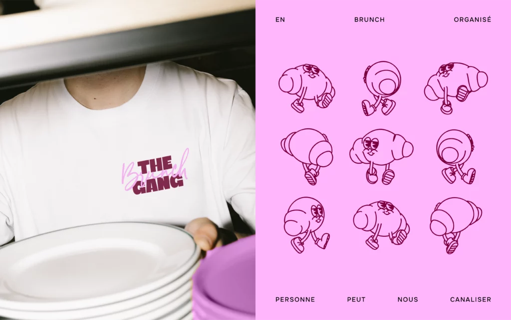 L’identité de The Brunch Gang se savoure comme une tartine généreuse : une explosion de couleurs franches, de typographies gourmandes et d’illustrations espiègles. Pensée comme une déclaration d’appétit et de convivialité, elle incarne l’énergie sucrée-salée des brunchs parisiens où se croisent joie, partage et excentricité.